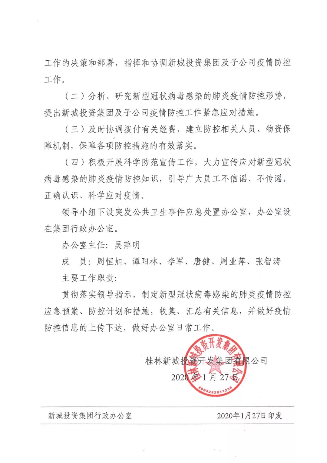 新城投資集團(tuán)上下立即行動(dòng)起來(lái),堅(jiān)決貫徹落實(shí)黨中央的決策部署以及省、市委市政府相關(guān)要求,成立了突發(fā)公共衛(wèi)生事件應(yīng)急工作領(lǐng)導(dǎo)小組,統(tǒng)籌協(xié)調(diào)相關(guān)工作。集團(tuán)黨支部結(jié)合實(shí)際,組織全體職工特別是黨員采取切實(shí)有效措施開展防控,抓好疫情防控工作,堅(jiān)決遏制疫情蔓延勢(shì)頭。