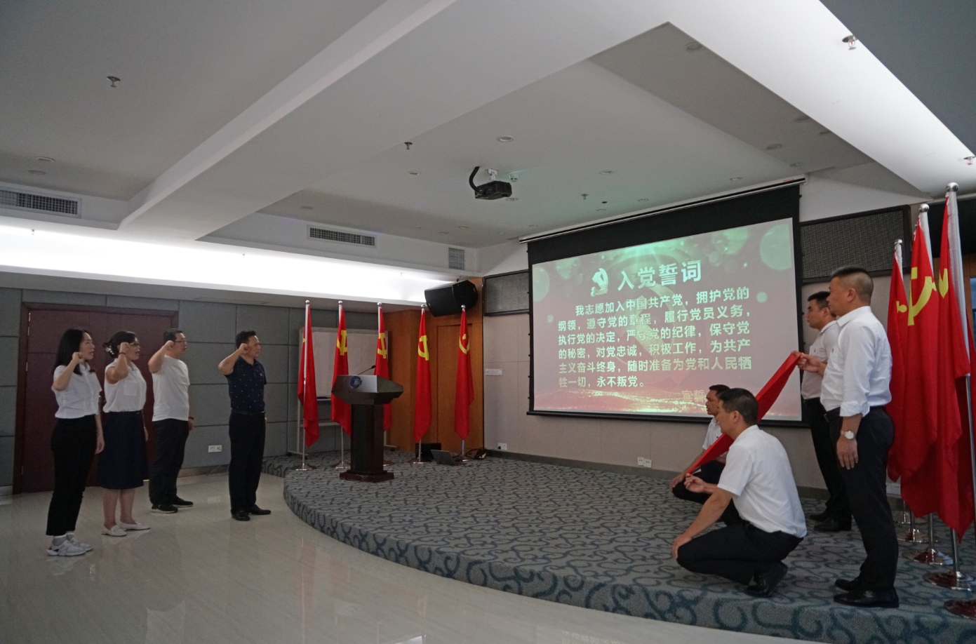 為引導(dǎo)黨員繼承發(fā)揚(yáng)老一輩革命家光榮傳統(tǒng),激發(fā)新黨員激情斗志,會(huì)場(chǎng)組織新發(fā)展的3名黨員周恒旭、劉萍、梁慧穎舉行了入黨宣誓,同時(shí),全體黨員重溫入黨誓詞。