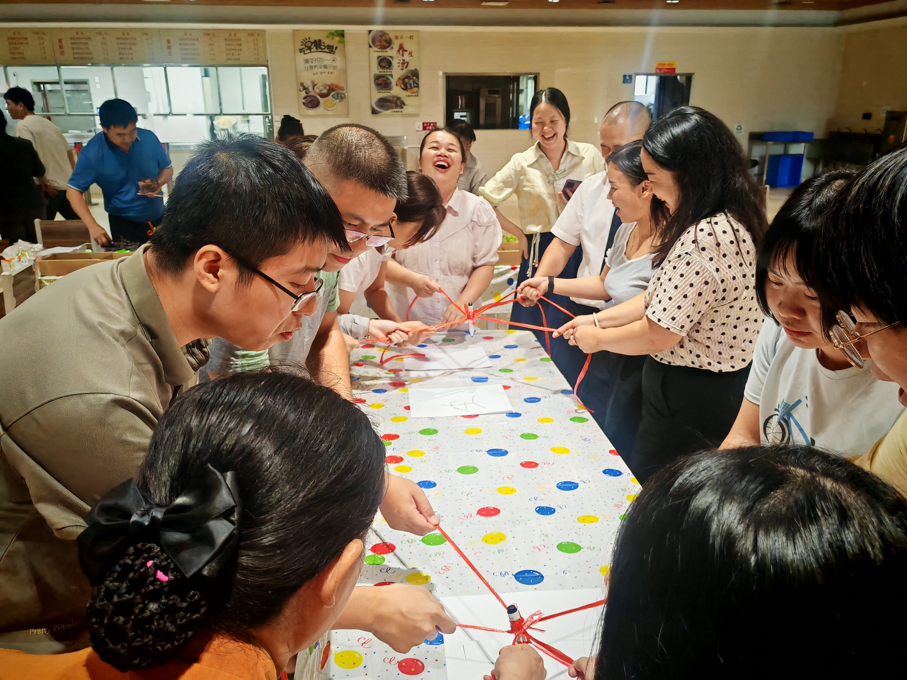 這是最考驗(yàn)團(tuán)隊(duì)協(xié)作的環(huán)節(jié)。六人一組,每人牽一根繩子共同控制筆尖,寫(xiě)出一行字或畫(huà)出圖案??此坪?jiǎn)單,卻讓人手忙腳亂,常常一筆下去就引得全場(chǎng)大笑。但最終,大家齊心協(xié)力完成作品時(shí),也收獲了滿滿成就感。