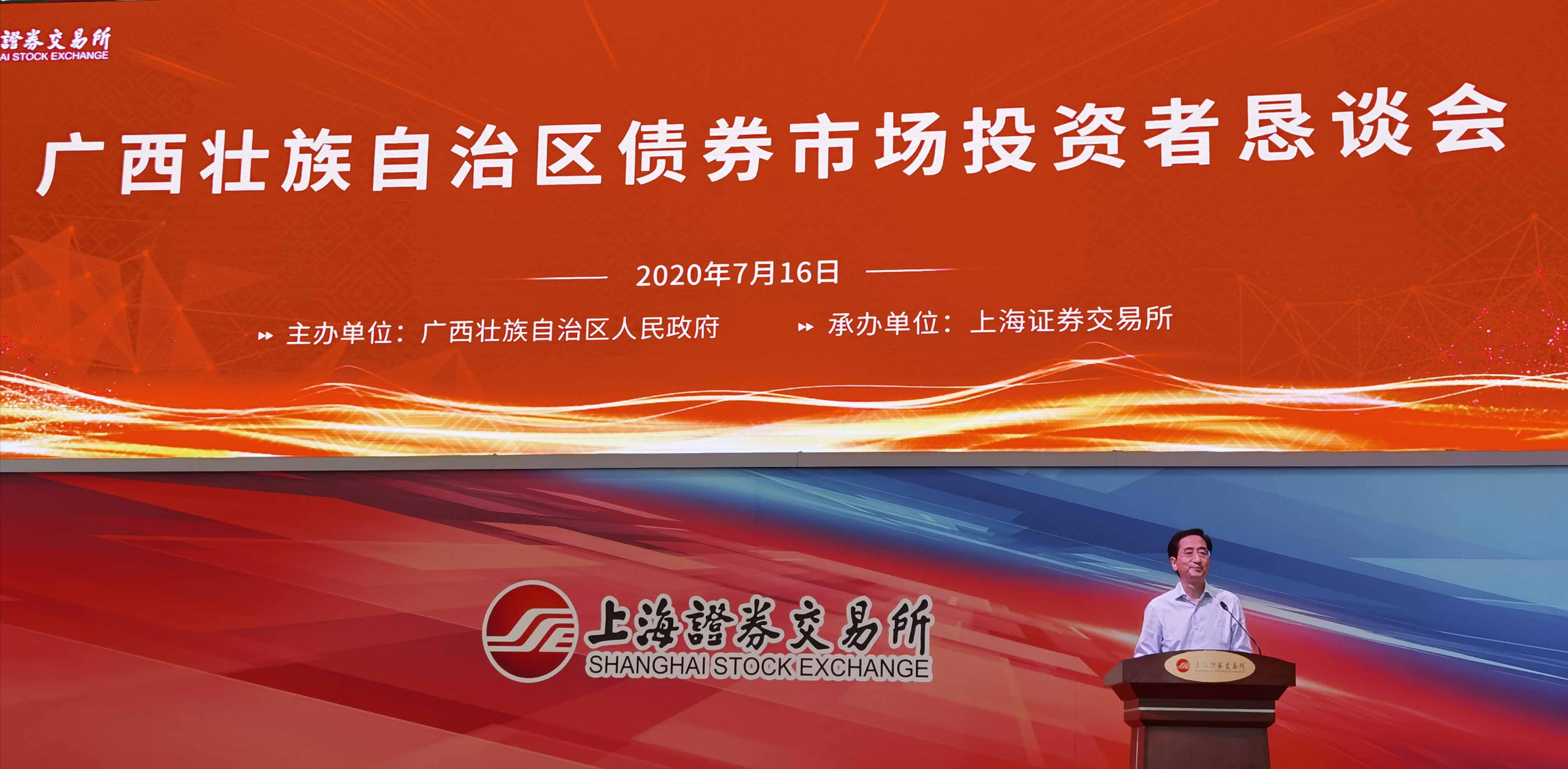 為貫徹落實《中共中央 國務(wù)院關(guān)于新時代推進西部大開發(fā)形成新格局的指導意見》,提升西部地區(qū)直接融資比例,切實提升廣西債券融資能力,助推廣西經(jīng)濟高質(zhì)量發(fā)展,廣西壯族自治區(qū)人民政府于2020年7月16日在上海證券交易所舉辦了廣西壯族自治區(qū)債券市場投資者懇談會。國泰君安證券、申港證券、交通銀行等國內(nèi)30余家金融機構(gòu)代表及廣西投資集團、北部灣投資集團、廣西物質(zhì)集團、柳州東城集團等20余家廣西區(qū)內(nèi)大型知名企業(yè)參加了本次懇談會。上海證券交易所黨委書記、理事長黃紅元(副部長級)出席會議,上海證券交易所副副總經(jīng)理劉紹統(tǒng)、廣西區(qū)人大常委會副主任張曉欽先后致辭發(fā)言,廣西金融監(jiān)管局、廣西財政廳負責人介紹了廣西債券發(fā)行工作情況。