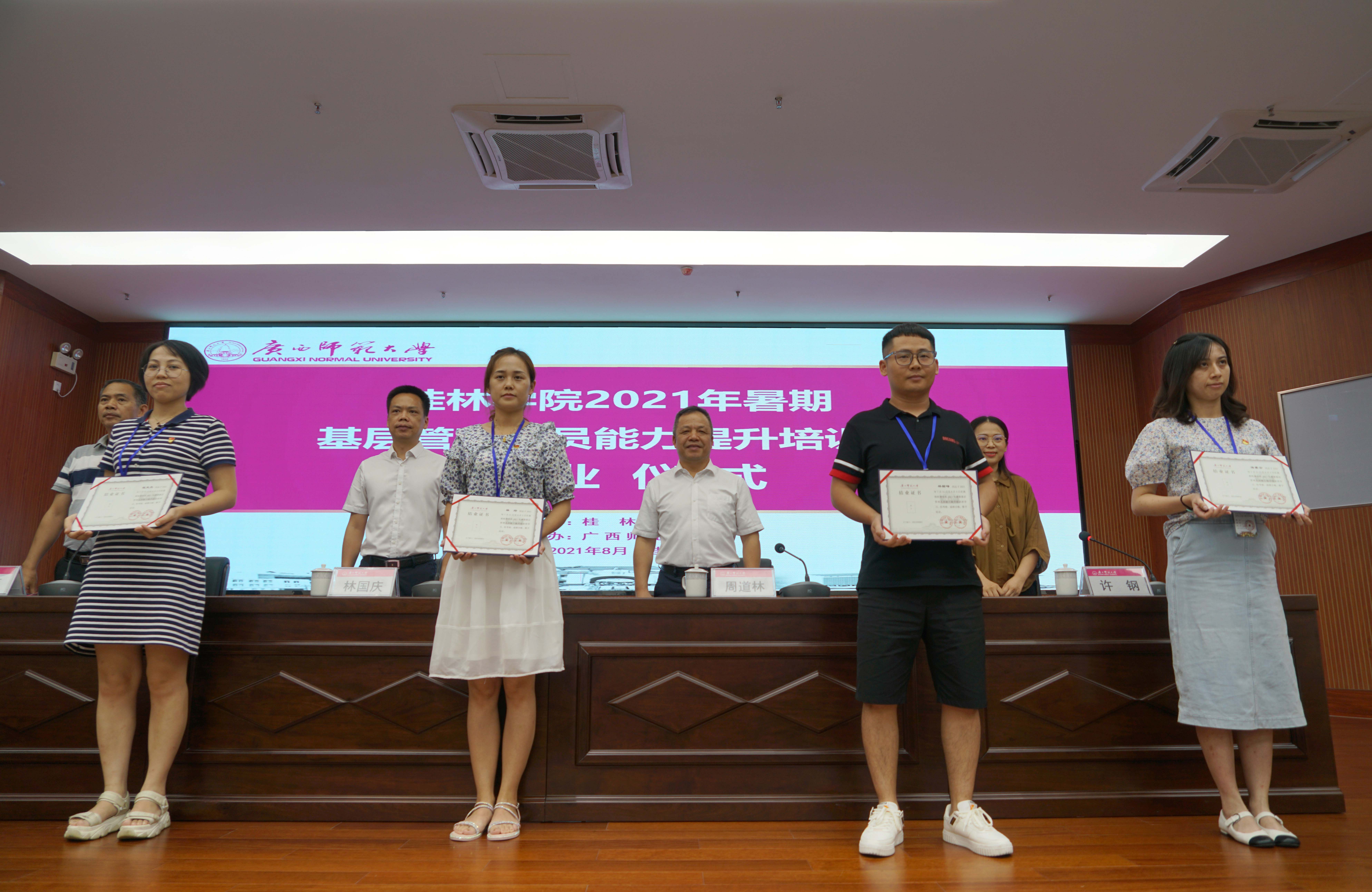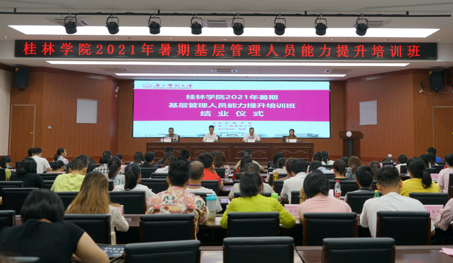 8月2日下午,桂林學院基層管理人員能力提升培訓班結業(yè)儀式在廣西師范大學育才校區(qū)國際教育交流中心報告廳舉行,共有來自桂林學院的98名基層管理人員參加了這次為期三天的培訓。廣西師范大學黨委常委、組織部部長林國慶,桂林新城投資集團黨總支書記、董事長、總經理、桂林學院董事長周道林,桂林學院校長楊樹喆等出席結業(yè)儀式。廣西師范大學干部教育培訓學院辦公室主任許鋼主持結業(yè)儀式。