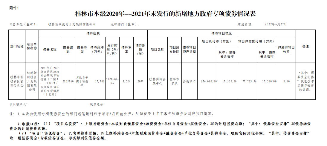 截至2021年末,桂林新城投資開發(fā)集團(tuán)有限公司獲得2021年新增政府專項(xiàng)債券資金17,500.00萬元,安排用于本部門及所屬單位1個(gè)項(xiàng)目,其中:桂林國際會(huì)展中心項(xiàng)目17,500.00萬元,從債券項(xiàng)目資產(chǎn)類型看,主要是會(huì)展中心。從項(xiàng)目實(shí)施進(jìn)度看,該項(xiàng)目總投資676,000.00萬元,其中2021年債券資金安排17,500.00萬元;截至2021年末已實(shí)現(xiàn)投資77,733.56萬元,其中2021年債券資金安排17,500.00萬元。從項(xiàng)目運(yùn)營情況看,截至2021年末,截至2021年末,該項(xiàng)目尚在建設(shè)期未運(yùn)營。