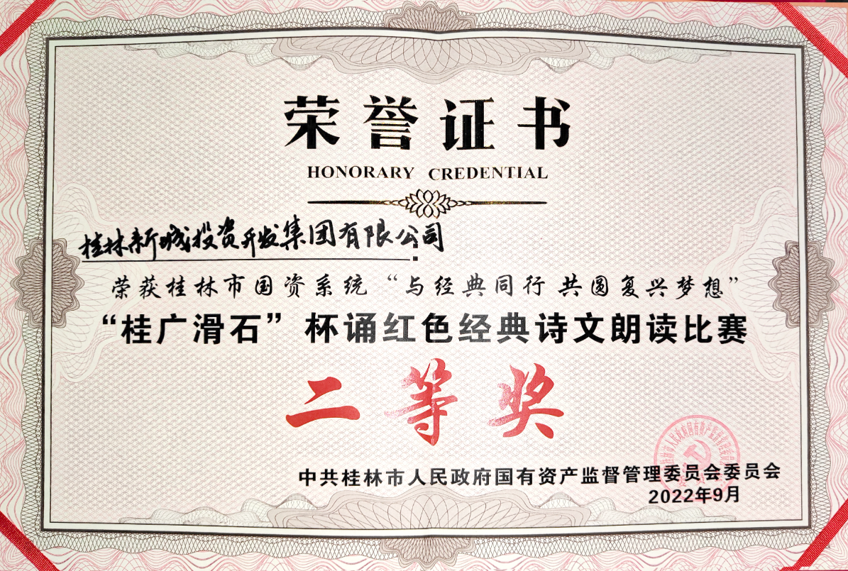 為彰顯傳統(tǒng)文化的獨(dú)特魅力,傳承千年優(yōu)良經(jīng)典文化與紅色基因,2022年9月23日,由桂林市人民政府國(guó)有資產(chǎn)監(jiān)督管理委員會(huì)主辦的“強(qiáng)國(guó)復(fù)興有我”主題教育——“與經(jīng)典同行,共圓復(fù)興夢(mèng)想”誦紅色經(jīng)典詩(shī)文朗讀比賽(決賽)在一院兩館小劇場(chǎng)舉行。本次比賽評(píng)出一等獎(jiǎng)2個(gè),二等獎(jiǎng)3個(gè),三等獎(jiǎng)4個(gè)。新城投集團(tuán)選送的詩(shī)朗誦情景劇《不朽的軍魂》憑借真摯的情感,轉(zhuǎn)折起伏的情節(jié),從19支決賽隊(duì)伍中脫穎而出,獲得二等獎(jiǎng)的好成績(jī)。桂林市國(guó)資委黨委書(shū)記、主任裴軍等出席活動(dòng)。