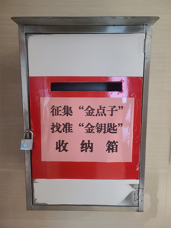 在公司15樓設(shè)置征集“金點(diǎn)子”找準(zhǔn)“金鑰匙”收納箱,直接由總經(jīng)理開取收納箱??偨?jīng)理將根據(jù)方案的可行性安排時間與提出方案的個人及團(tuán)隊(duì)見面,聽取方案介紹,探討落實(shí)對策。