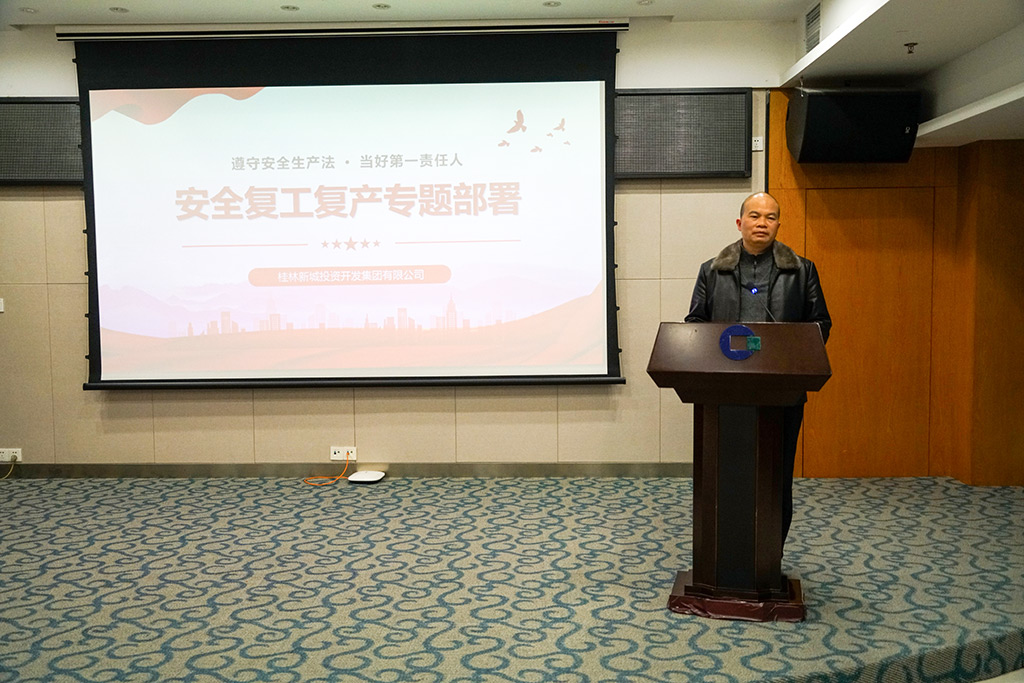 為深入貫徹落實(shí)桂林市國資委及城建集團(tuán)關(guān)于節(jié)后復(fù)工復(fù)產(chǎn)的工作要求,進(jìn)一步做好春節(jié)后企業(yè)安全復(fù)工復(fù)產(chǎn)工作,確保全國“兩會”前后全區(qū)安全穩(wěn)定。2024年3月4日,新城投集團(tuán)召開2024年春節(jié)后安全復(fù)工復(fù)產(chǎn)工作專題部署會暨全體員工節(jié)后復(fù)工復(fù)產(chǎn)動(dòng)員大會,會議針對近期全國消防火災(zāi)事故頻發(fā)現(xiàn)狀進(jìn)行了警示宣傳教育,同時(shí)傳達(dá)上級安全復(fù)工復(fù)產(chǎn)、火災(zāi)防控等相關(guān)文件精神。受公司黨委副書記(主持工作)、副董事長、總經(jīng)理朱毅委托,黨委副書記兼紀(jì)委書記、監(jiān)事會主席、工會主席譚力源出席會議并講話,會議由公司黨委委員、董事、副總經(jīng)理葉青旺主持。