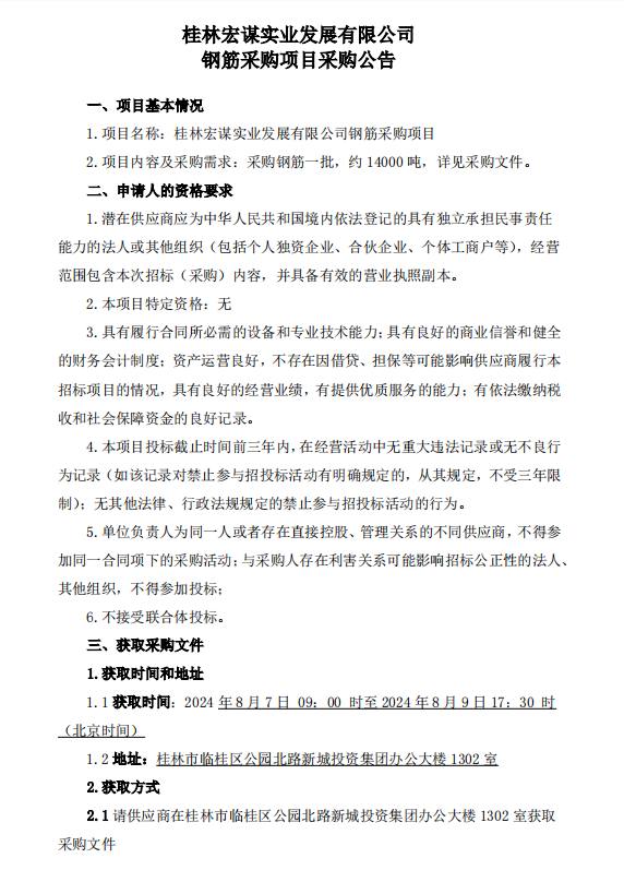 桂林宏謀實業(yè)發(fā)展有限公司鋼筋采購項目采購公告