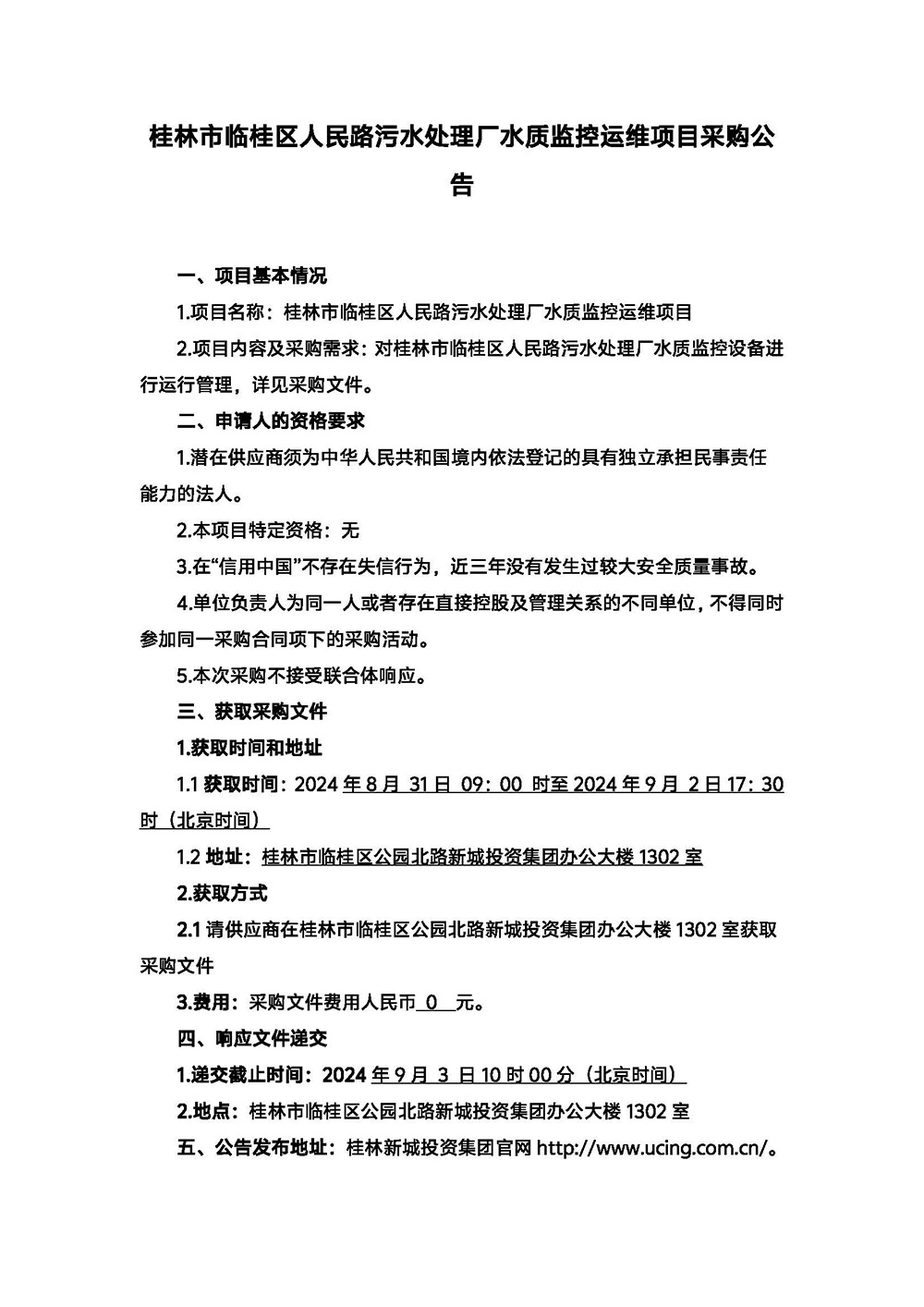 桂林市臨桂區(qū)人民路污水處理廠水質(zhì)監(jiān)控運(yùn)維項(xiàng)目采購公告