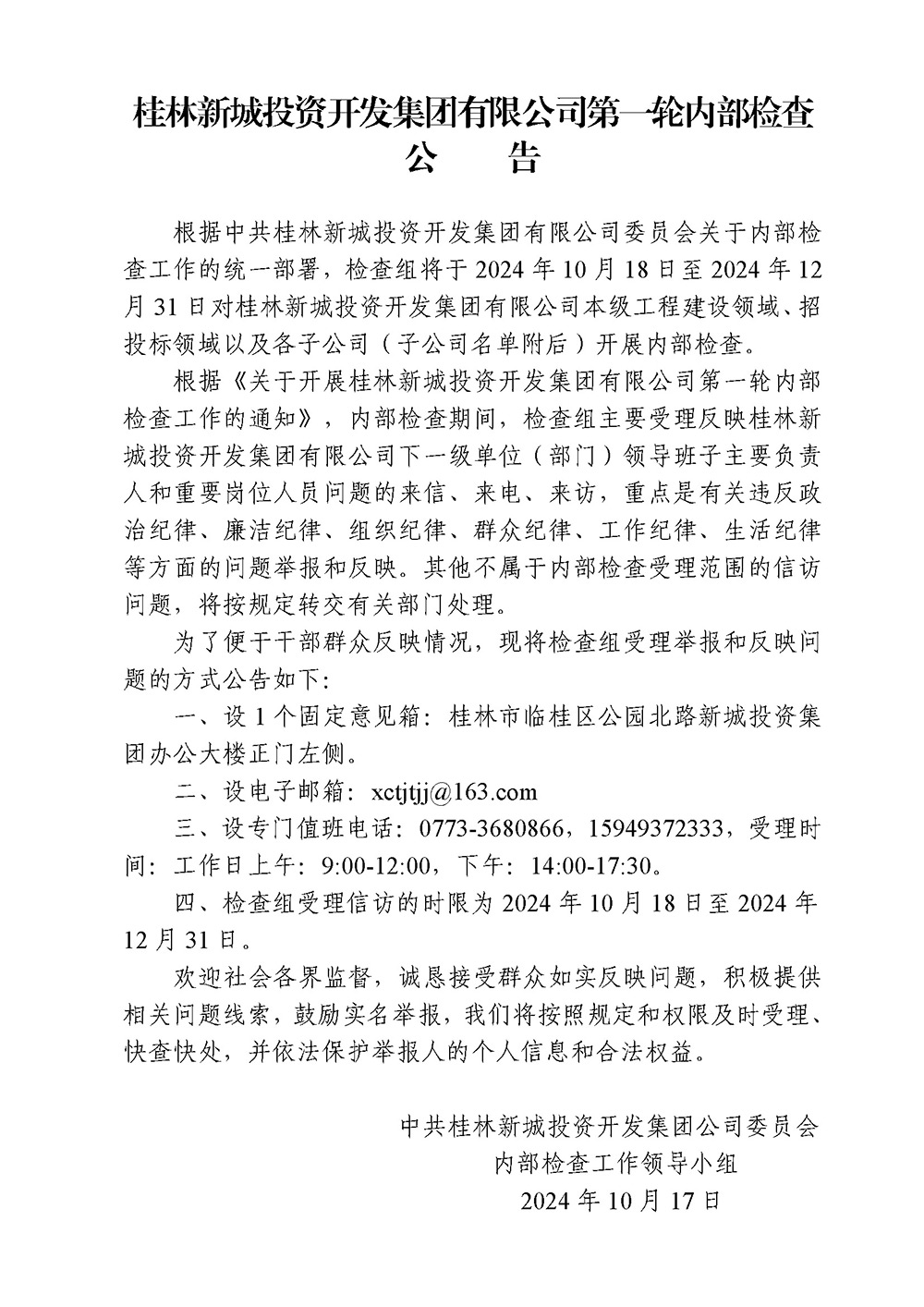 桂林新城投資開(kāi)發(fā)集團(tuán)有限公司第一輪內(nèi)部檢查公告