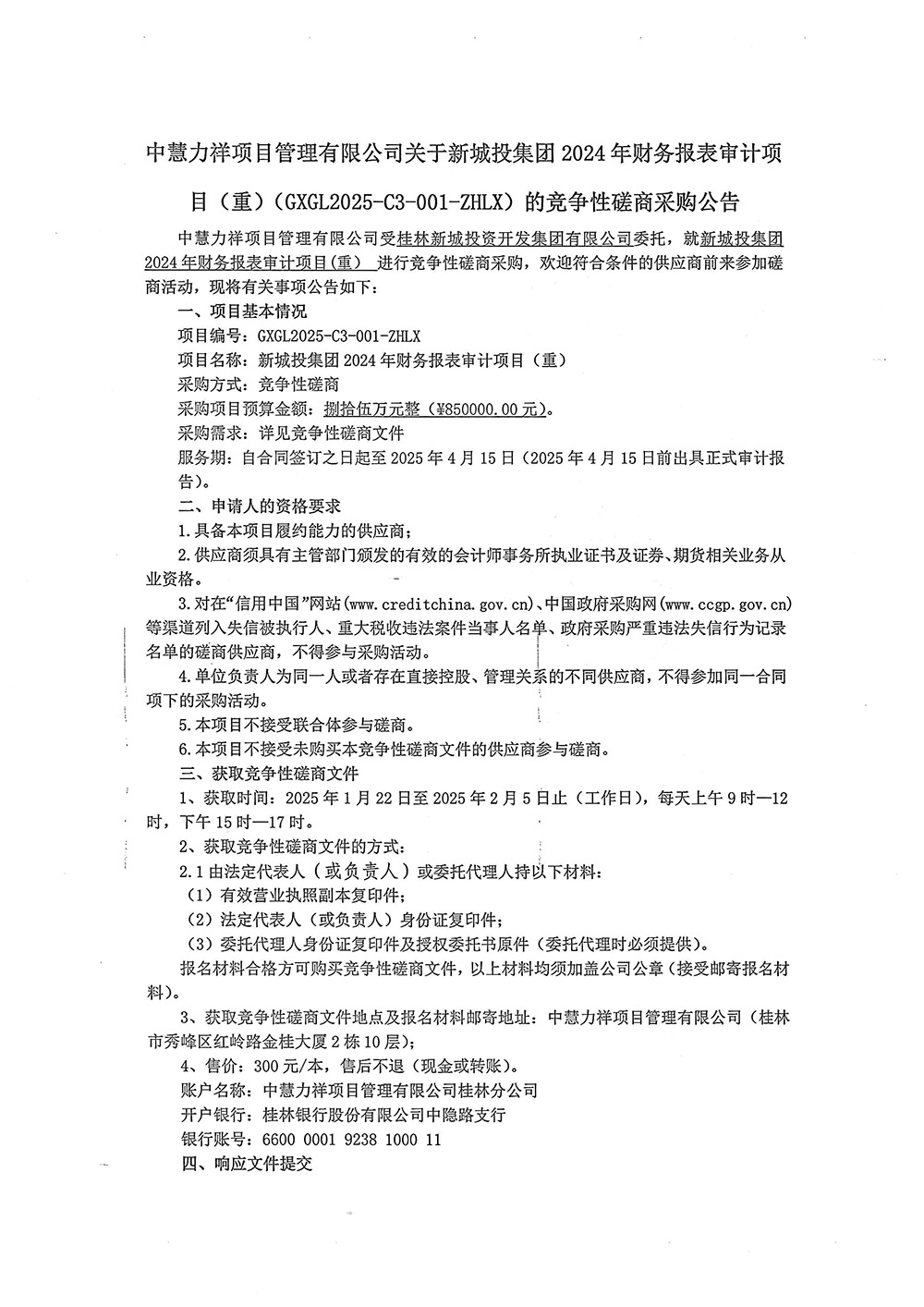 中慧力祥項目管理有限公司關(guān)于新城投集團2024年財務(wù)報表審計項目(重)(GXGL2025-C3-001-ZHLX)的競爭性磋商采購公告