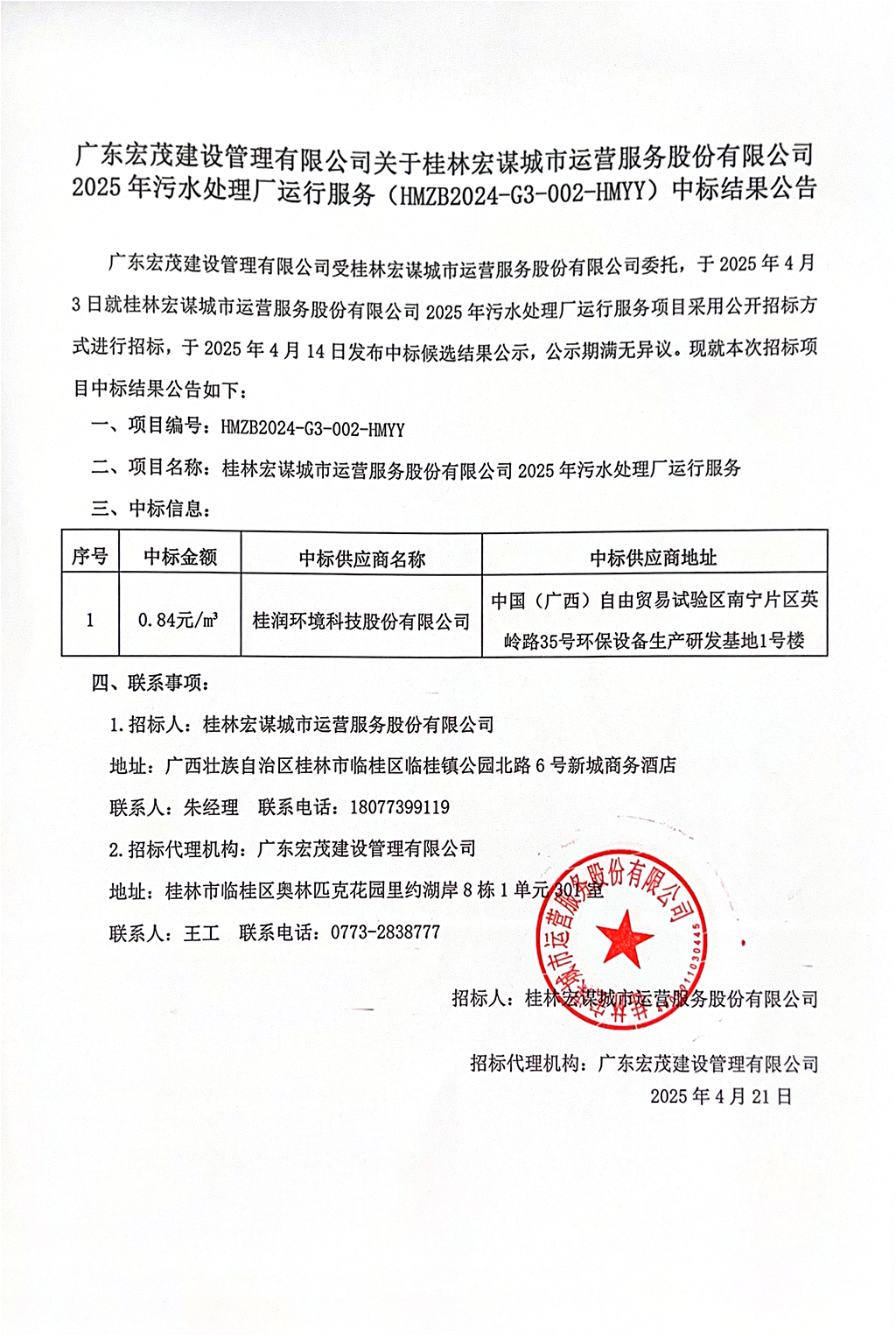 廣東宏茂建設(shè)管理有限公司關(guān)于桂林宏謀城市運營服務(wù)股份有限公司2025年污水處理廠運行服務(wù)(HMZB2024-G3-002-HMY)中標(biāo)結(jié)果公告