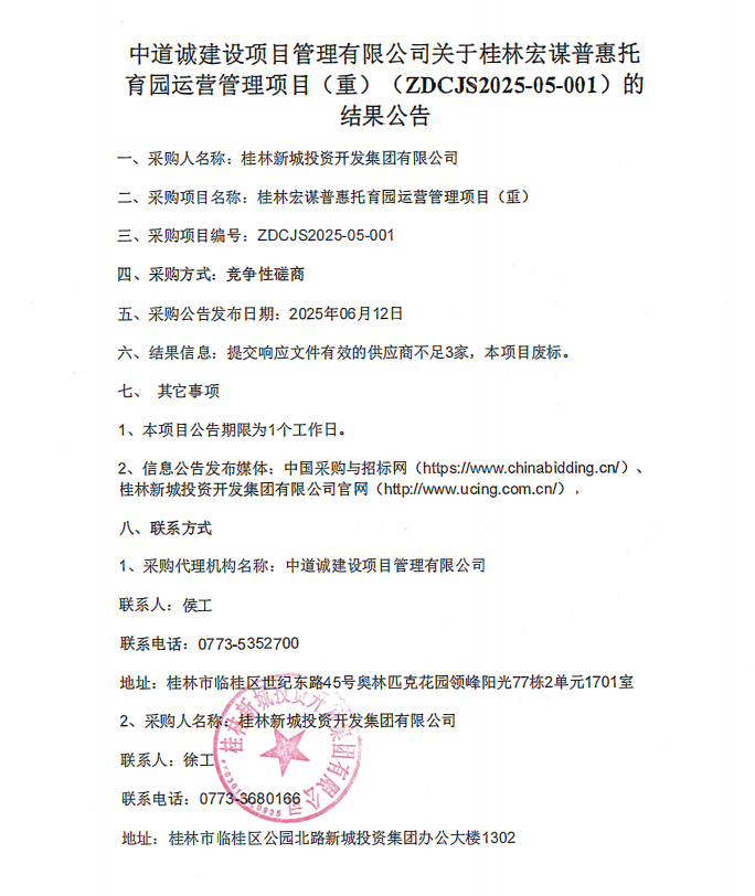 中道誠建設(shè)項(xiàng)目管理有限公司關(guān)于桂林宏謀普惠托育園運(yùn)營管理項(xiàng)目 ( 重 ) ( ZDCJS2025 - 05 - 001 ) 的結(jié)果公告