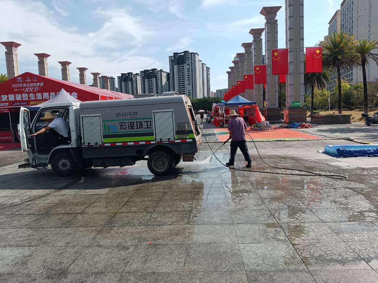 現場清潔:環(huán)衛(wèi)清洗車每日早晚高壓清洗地面,清除油污污漬,保障環(huán)境整潔。